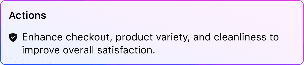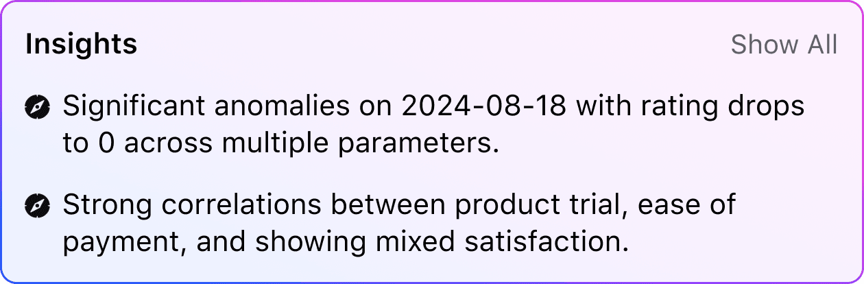 Surfaces what matters most, turning large volumes of feedback into clear, actionable insights instantly.