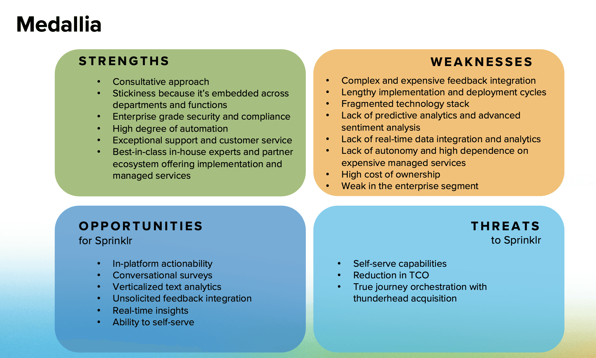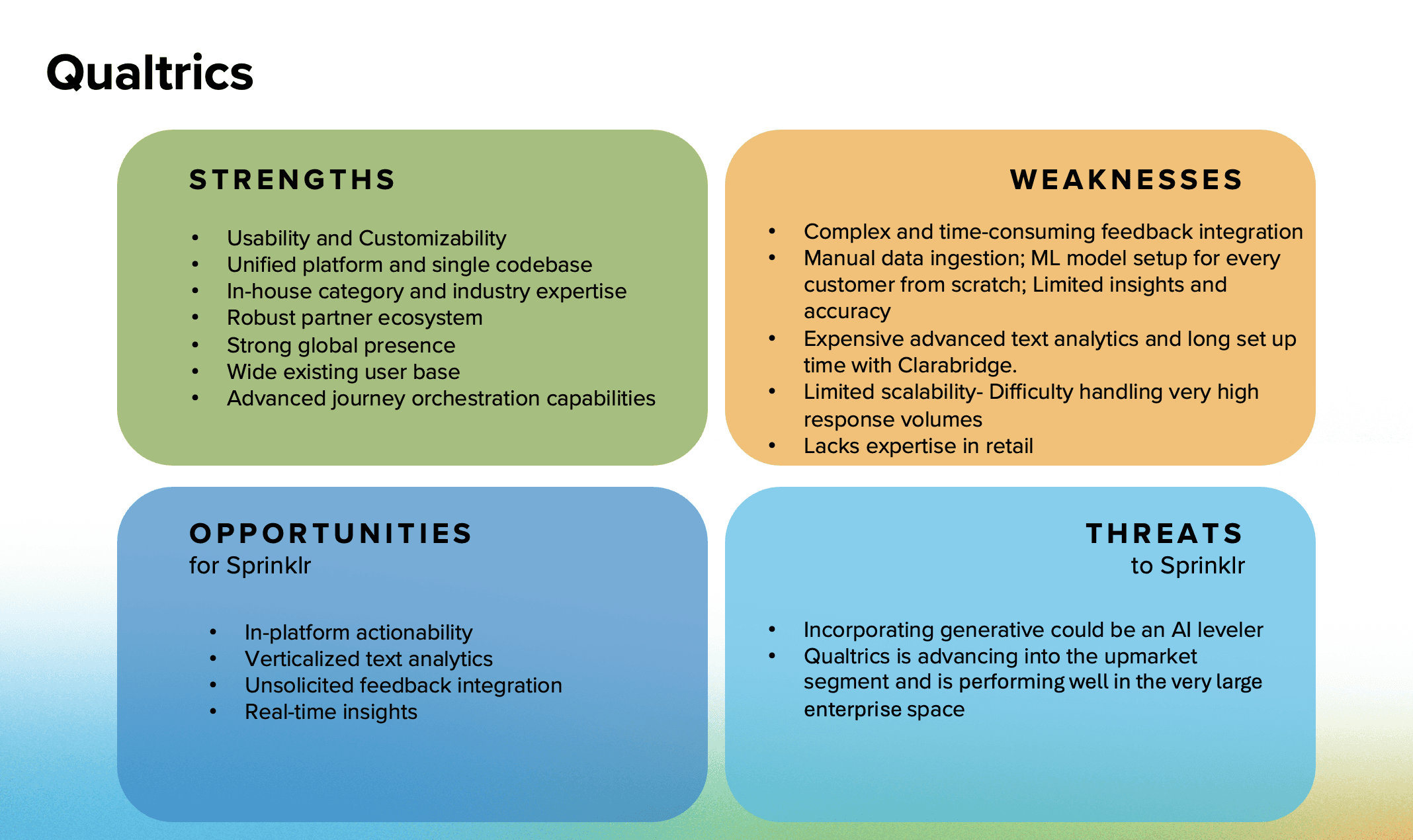 To evaluate today’s market gaps, I conducted a competitive audit of leading CFM platforms—Medallia and Qualtrics—analyzing their strengths and weaknesses to identify where Sprinklr can differentiate.